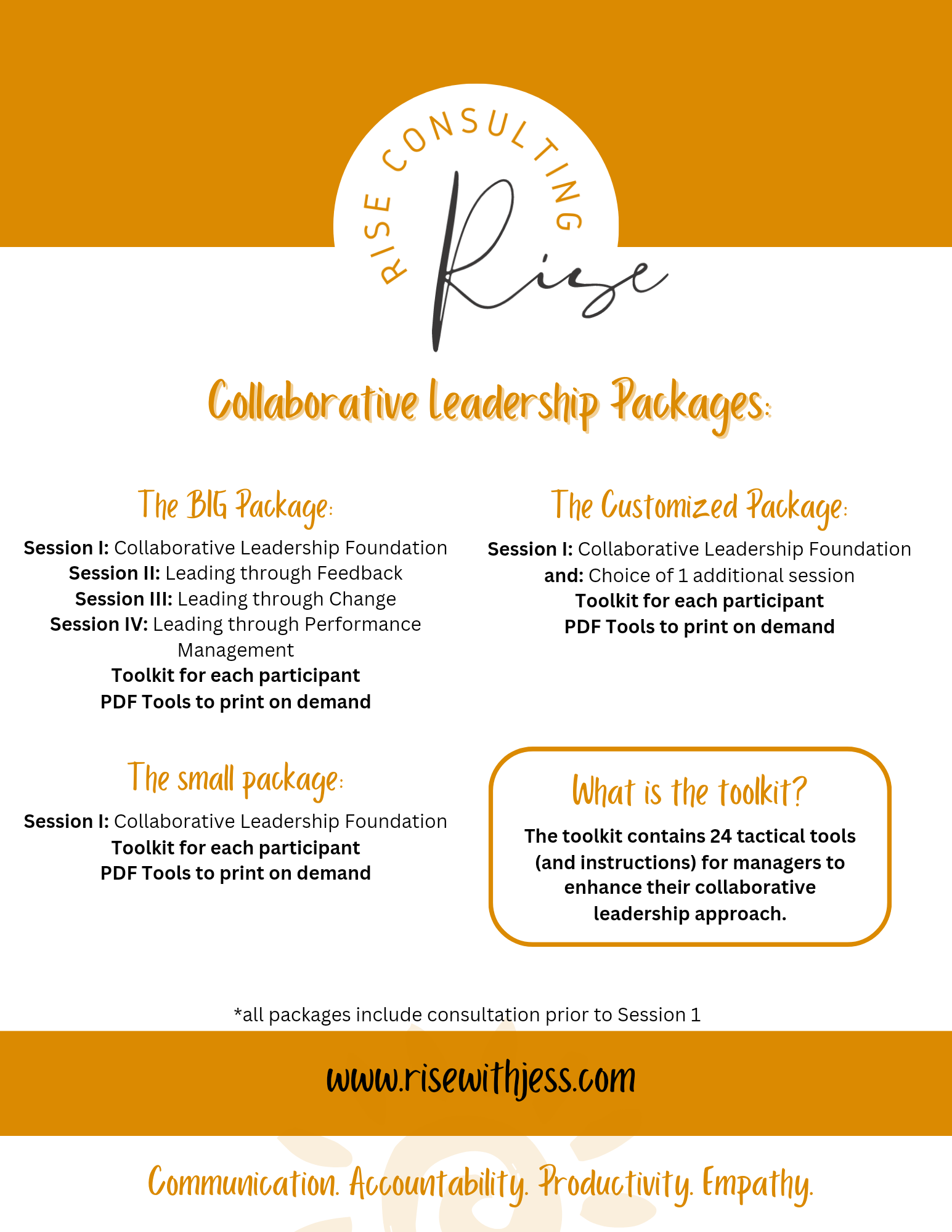 This series of 4 Collaborative Leadership Workshops can be attended in person or virtually. The sessions are designed to give your managers the support and tools they need to thrive in today’s business environment.